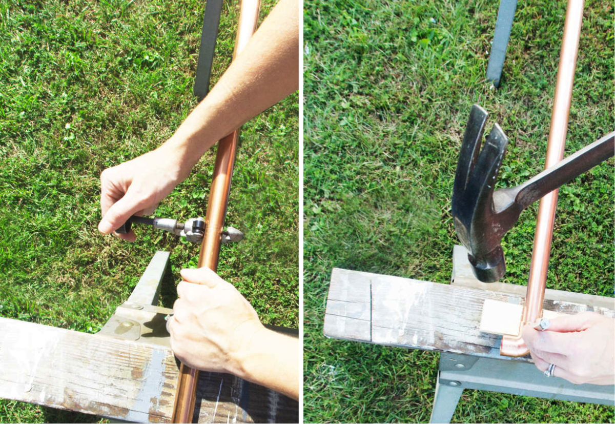10' piece of 3/4" copper pipe | 2 copper elbows | center punch | hammer | edge glued board (or plywood) | 4 post caps | pliers | select pine craft board | tubing cutter