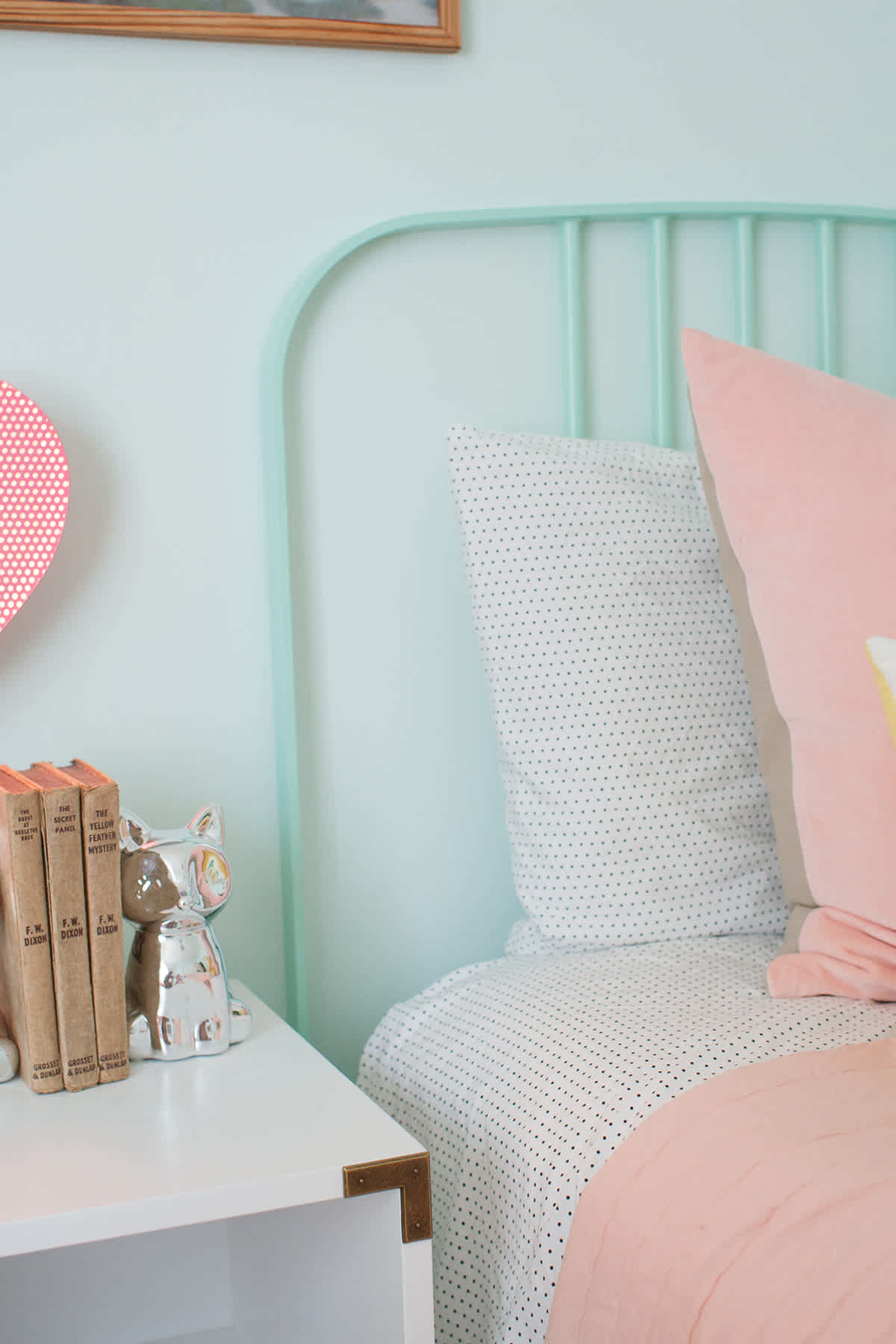I also love this mint metalwork bookcase (similar here). We used furniture pieces that felt lightweight, which makes the room feel extra open and bright. It's the perfect piece for displaying favorite toys and storing books.