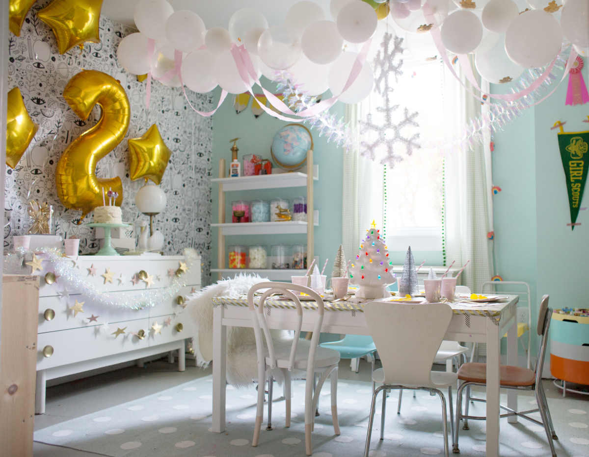 (Sources for above: White Ceramic Christmas Tree; Iridescent Garland; 2 Balloon; Star Balloons; Swan Lamp; Felix Chairs; Bookshelf; Tinsel Snowflakes; Wallpaper; more details on this room here)