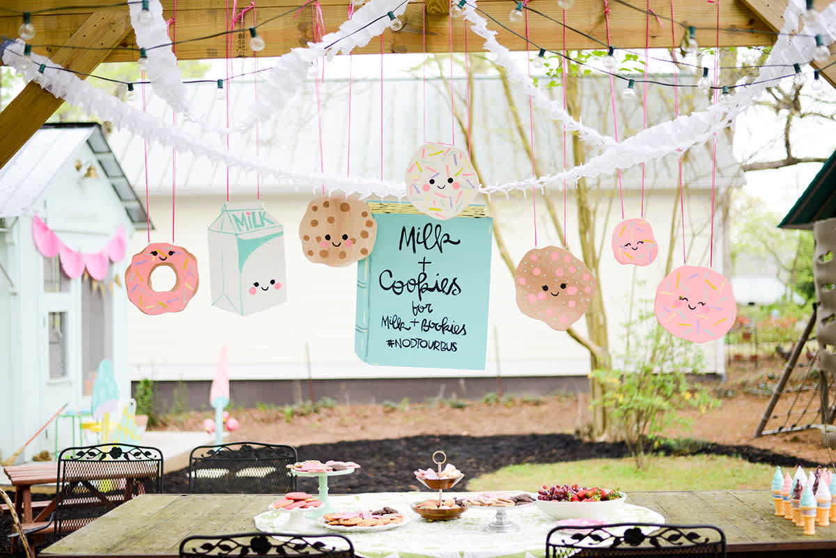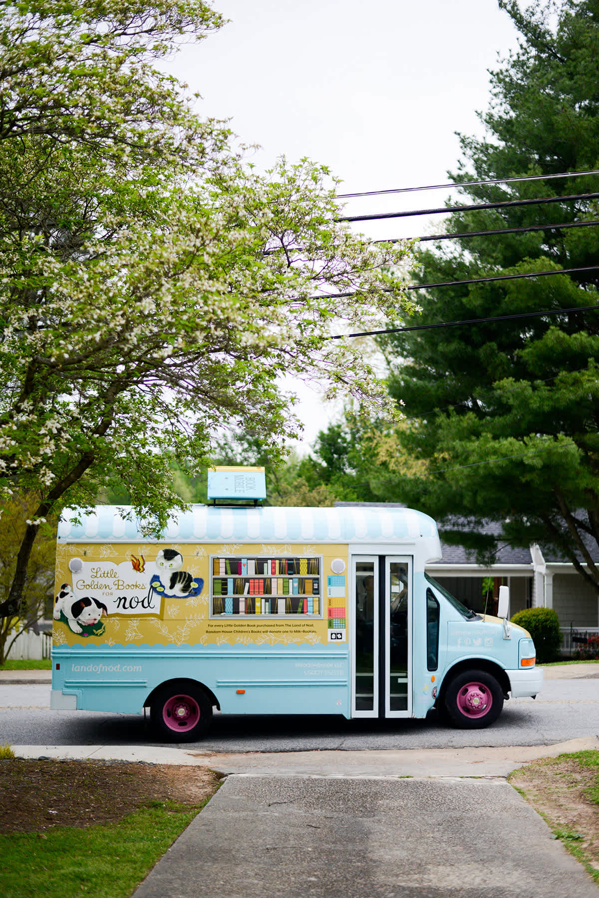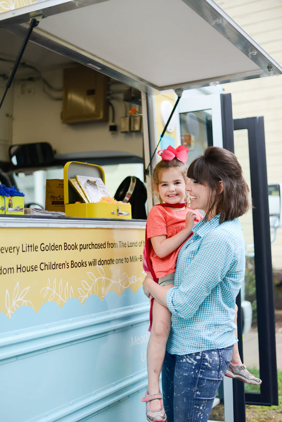 The Land of Nod just launched their adorable Little Golden Books collection, and to celebrate, they have decked out their Tour Bus with a similar feel, making stops in various cities this spring. They are selling a collection of Little Golden Books from the bus in collaboration with Milk + Bookies, an organization that gives books to children in need. To coordinate with the theme, we had some milk and cookies to snack on, and made some plywood cutouts of milk and cookies just to make it extra fun.