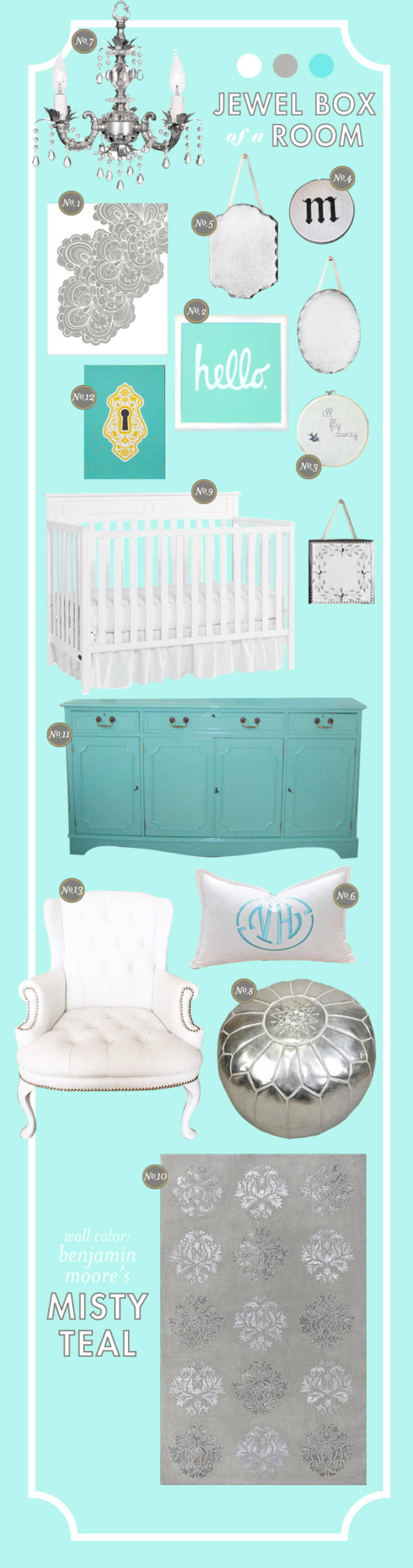 Shiny and sweet, this room is girly for sure. Add white molding or trim to the walls and keep the color scheme simple with turquoise/aqua, white, and silver for a sophisticated feel. If that chandelier is a bit pricey, go for one of these inexpensive Home Depot models and spruce them up with a bit of silver metallic spray paint. This rug also has a slightly friendlier price tag.