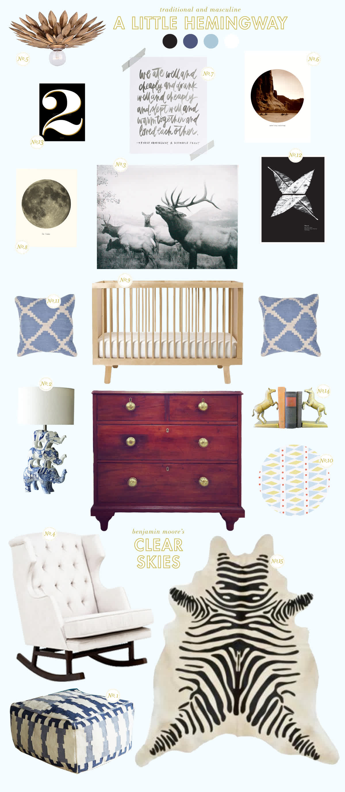 Here is a little nursery inspiration with a traditional feel and a calming palette of baby blues. I came across that gorgeous chest at Scott's last month, and snapped a photo to use as inspiration. I love the giant brass knobs and the way it looks as though it has a lot of good stories to tell . . .