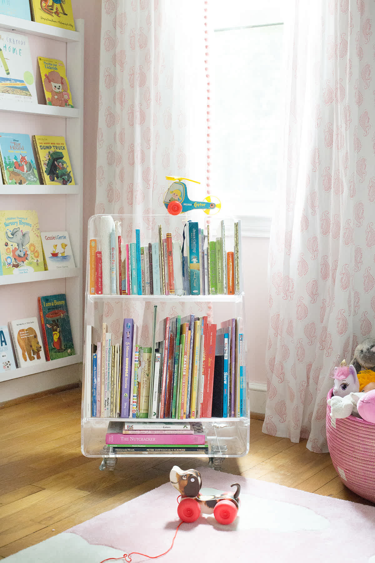 I feel like the books are constantly taking over, and we use every bit of this acrylic bookcart, the built in on the wall (go here for plans to build it!), and some of the metal one - and somehow we still have piles of books all over the place! It's a good problem to have, but I've learned you can never really have enough book storage.