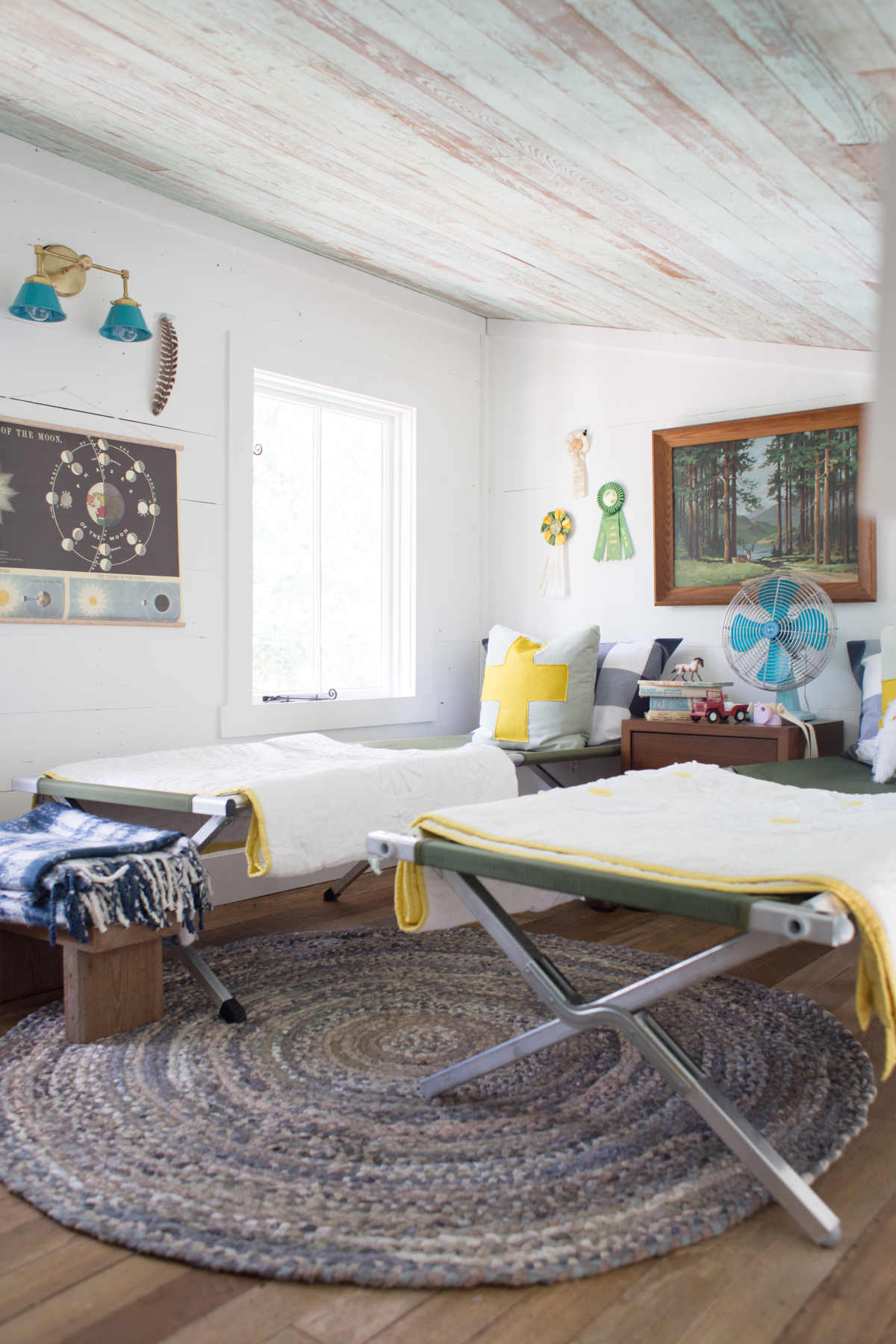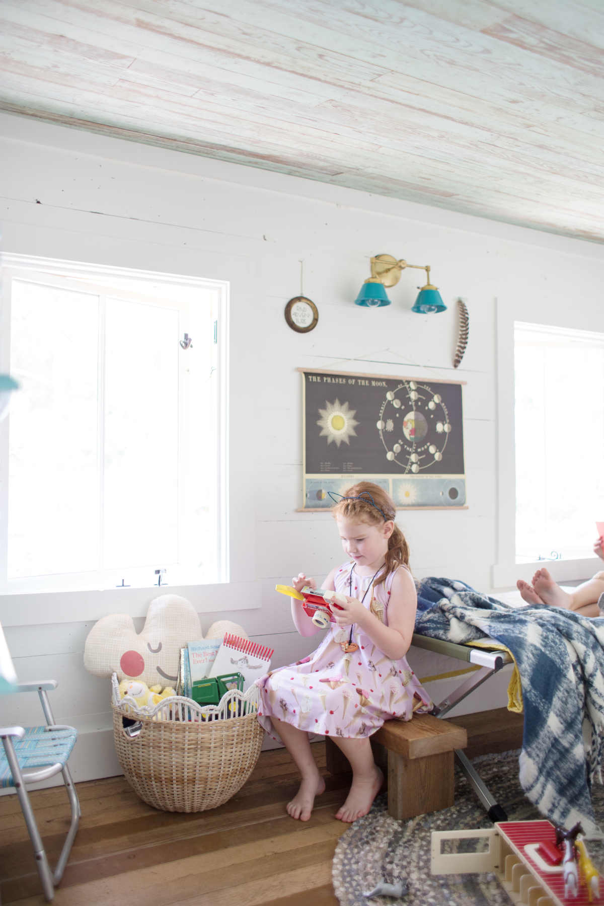 I really love that Jenny Lind bookcase for stashing toys and books. And how fun are the vintage kid lawn chairs? Can someone please start making them again? I think they are the cutest.