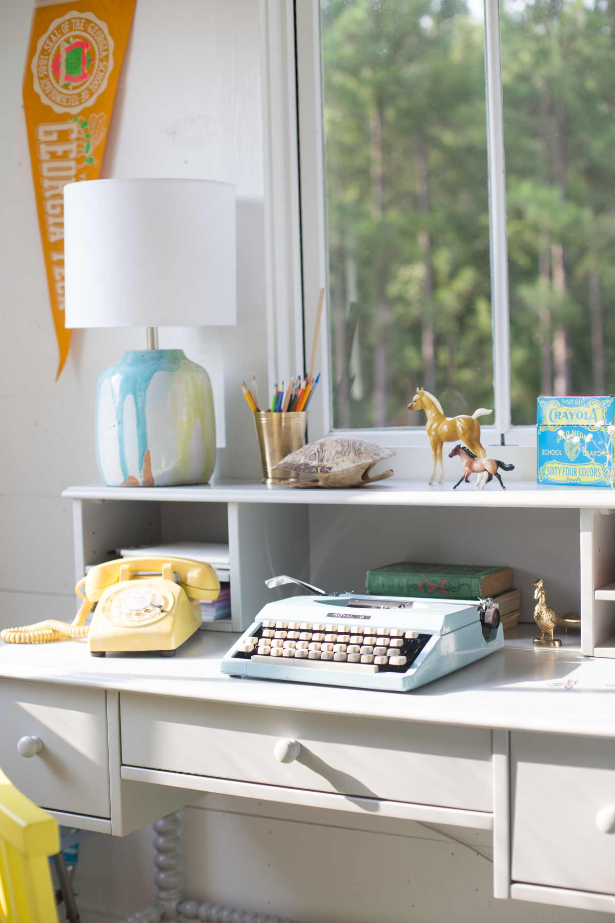 (Sources for above: Lamp; Jenny Lind Desk and Hutch; Yellow Chair; Rug; Cuckoo Clock; Sconce Source; Similar Vintage Typewriter; Fan; Vintage Folding Chair)