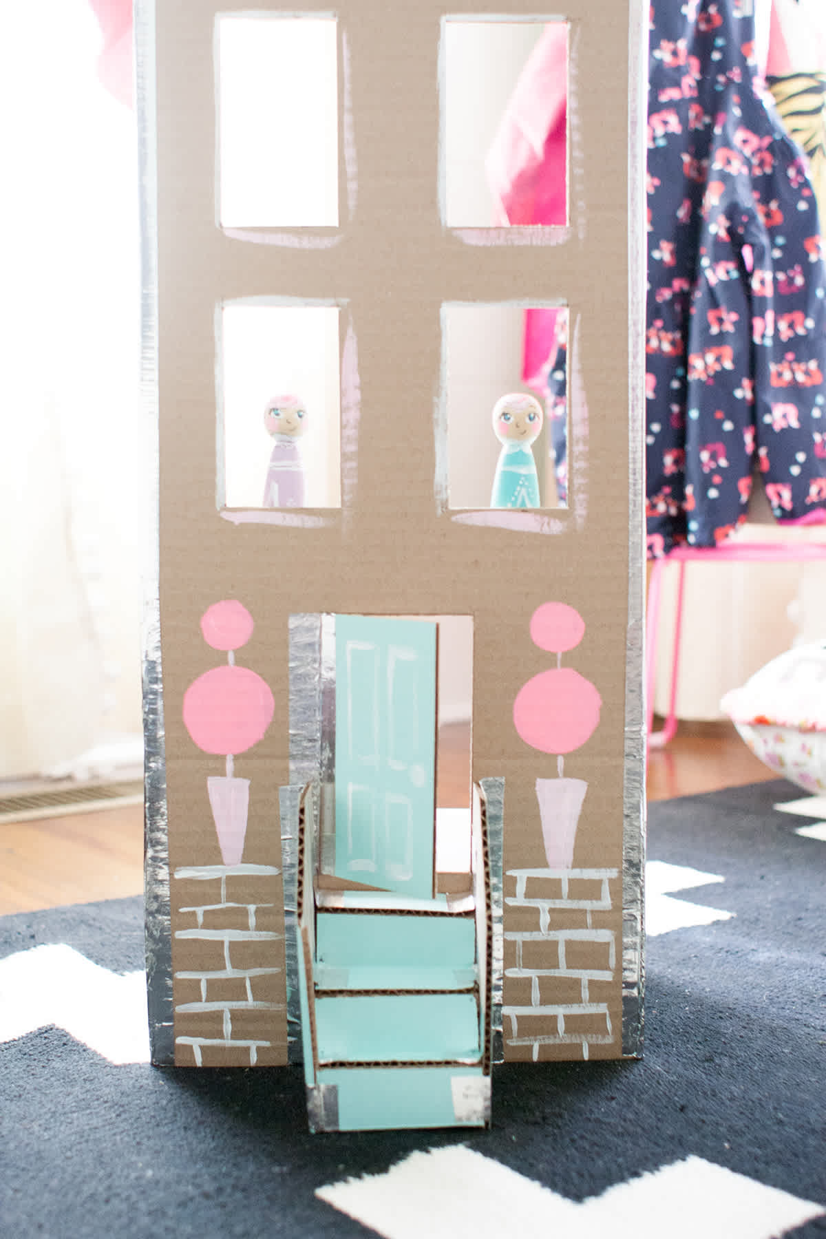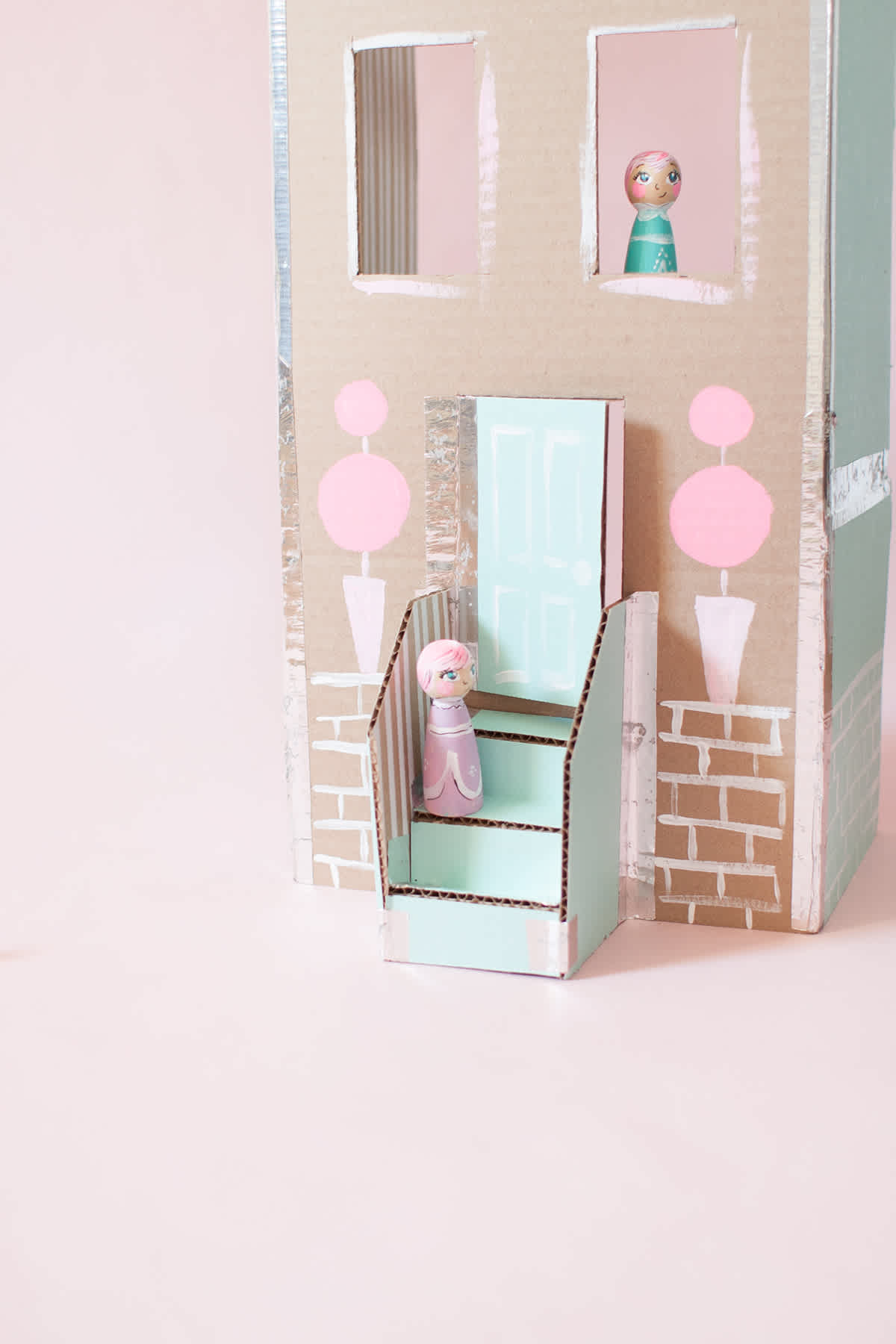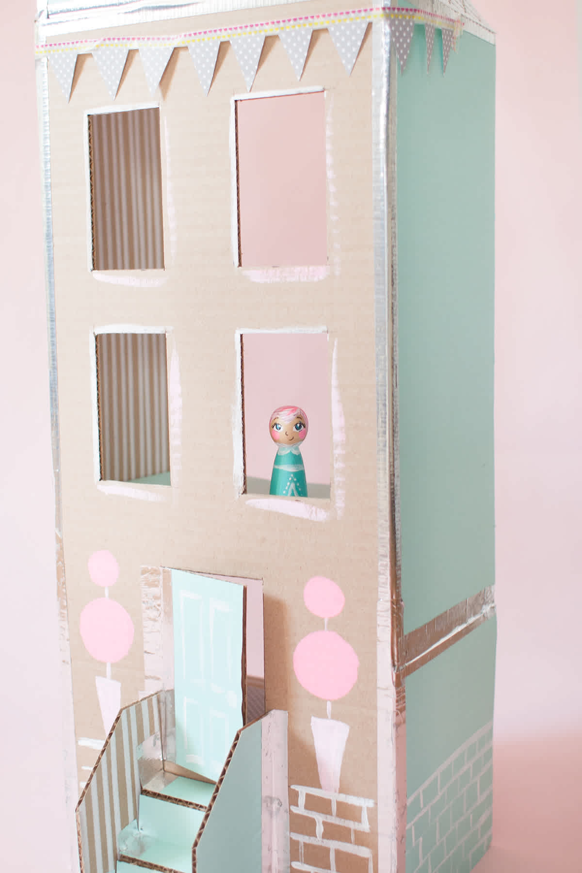 This little dollhouse was made from leftover Christmas boxes (specifically the Land of Nod ones, which have that beautiful mint blue interior!) and silver metallic duct tape.