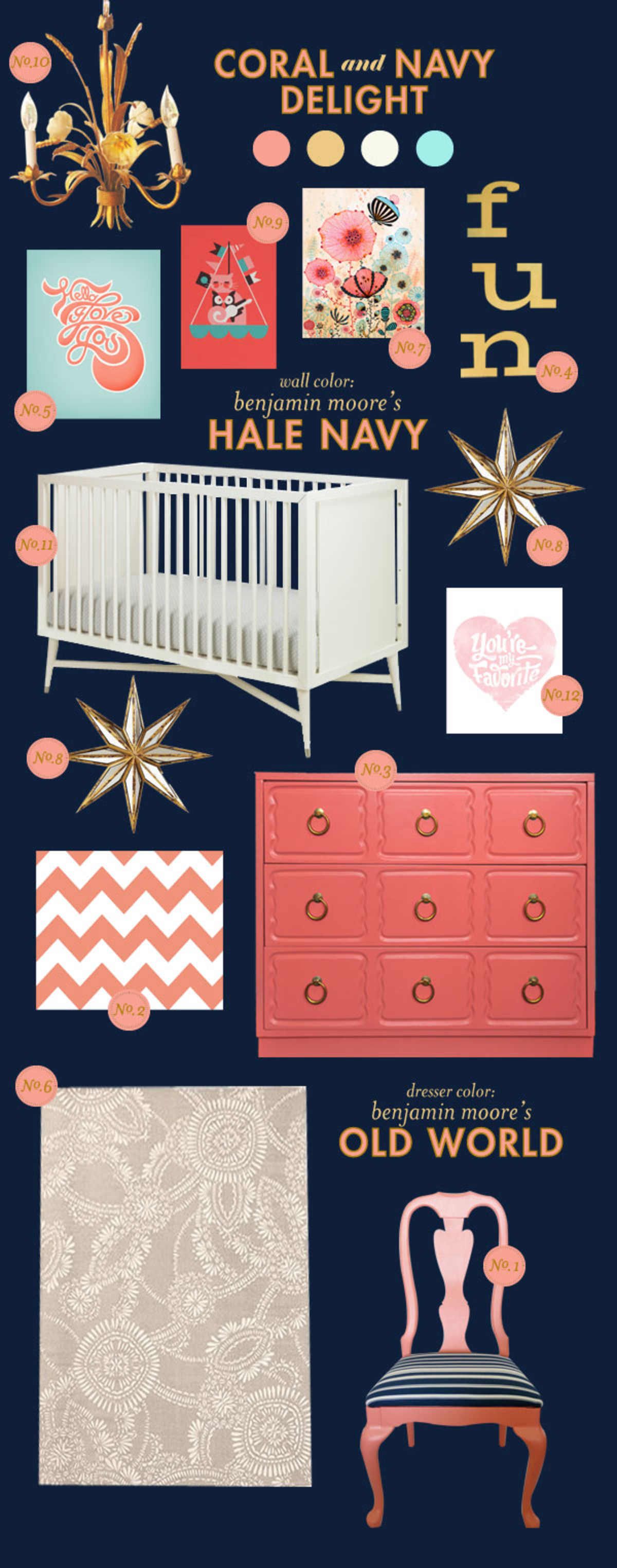 I'm sure y'all were wondering when I would get another style board post together! Between Vivi's birthday and the holidays, it has been a bit crazy, but here is the latest compilation. I have received a few requests for this color combination of coral and navy, so hopefully this will inspire those of you looking for something similar. That beautiful Dorothy Draper chest is sure to be pricey, but I found a similar color swatch, should you come across the perfect vintage find to paint yourself and adorn with gold hardware. It is the perfect pop against that rich navy!