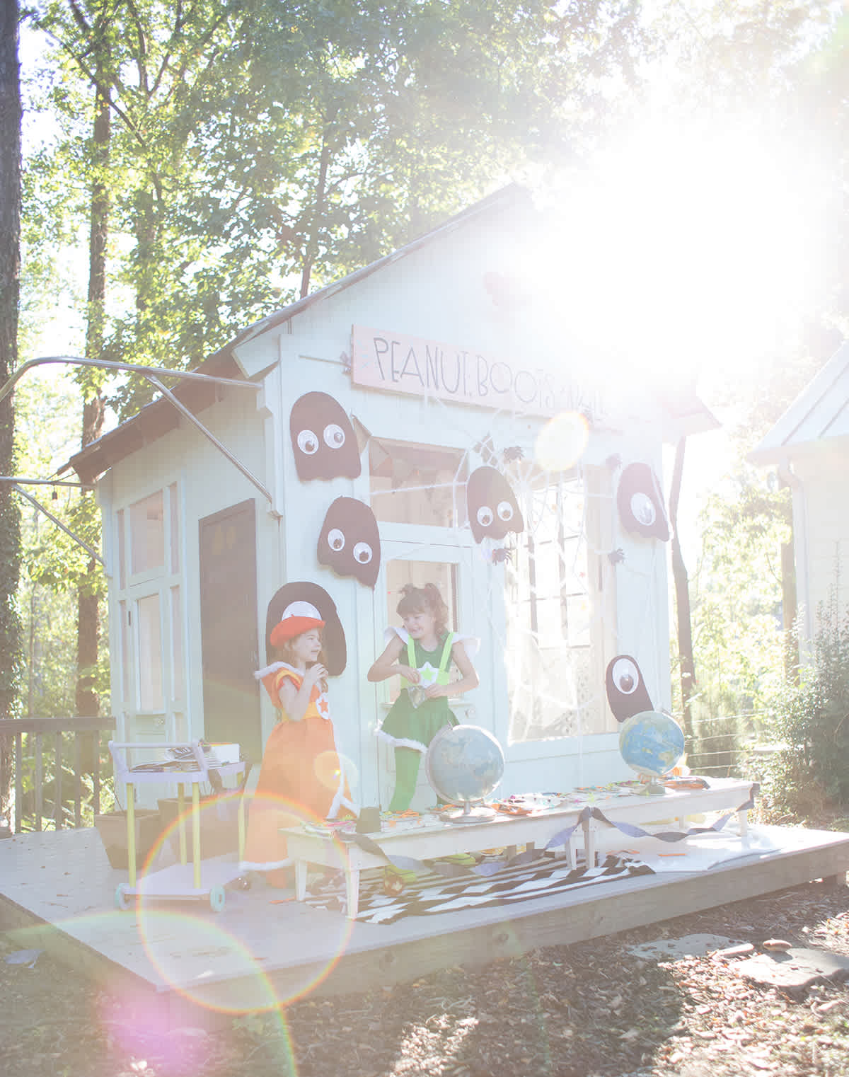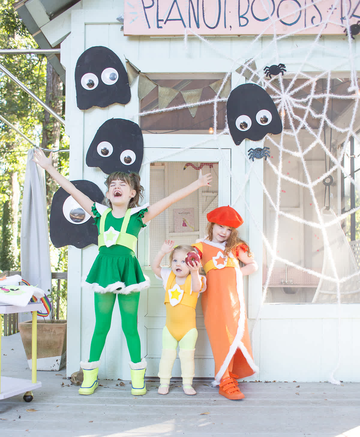 For the playhouse decorations, I put up cardboard ghosts with giant googly eyes, and a fun gigantic spiderweb.