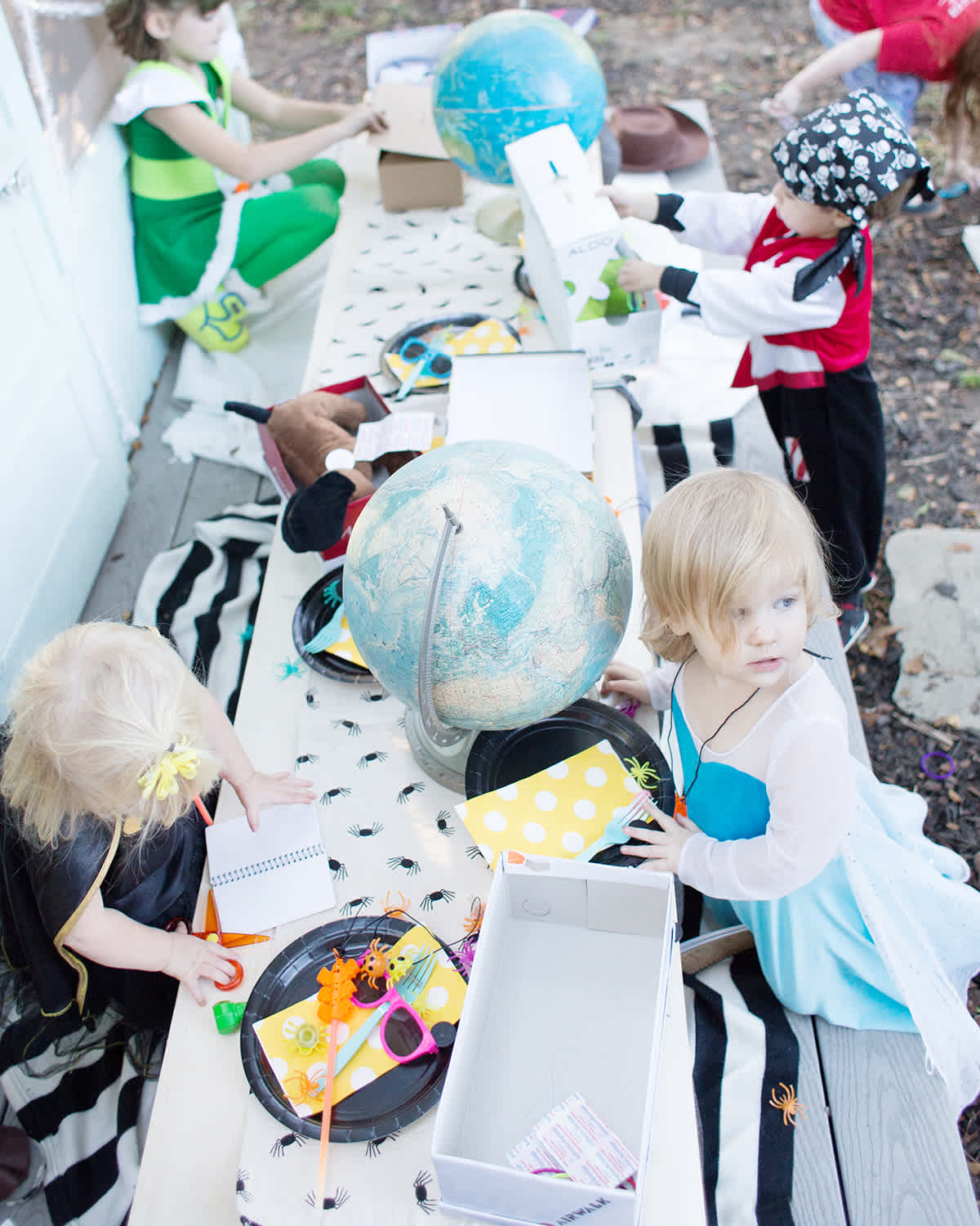 The girls had fun setting up for the party. We put our two little kid tables (which their Grandpa made a few years back for Vivi's birthday), and set them with plates, napkins, spider rings, and two globes to celebrate that we are loving on kids across the world with our project.