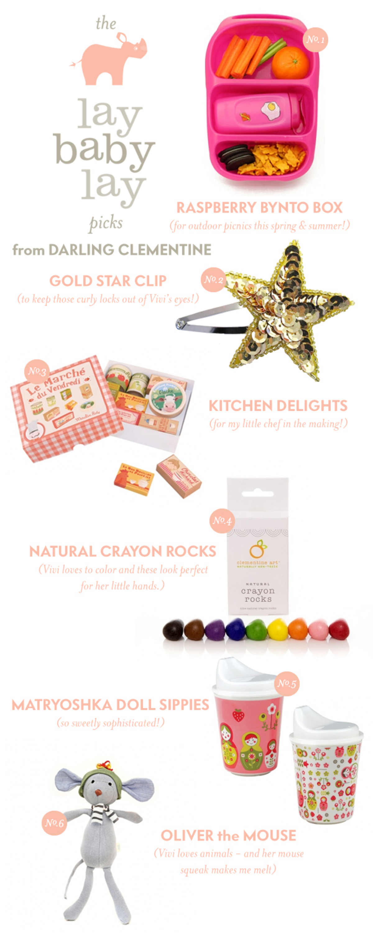 Lindsay from Darling Clementine was kind enough to let Lay Baby Lay select six picks from her shop to feature for March. Above are the items that I chose (although it was so hard to choose from all the cuteness - including books and clothes!). I just ordered the hair clip and can't wait to put it in Vivi's hair. What is even better is she is offering 10% off if you enter "laybabylay" upon checkout! (She also posted an interview on her tumblr - scroll down a little to find it - if you want to read a little more about Lay Baby Lay). Thanks so much, Lindsay!