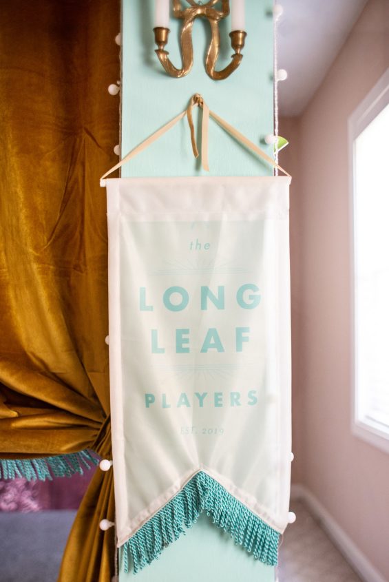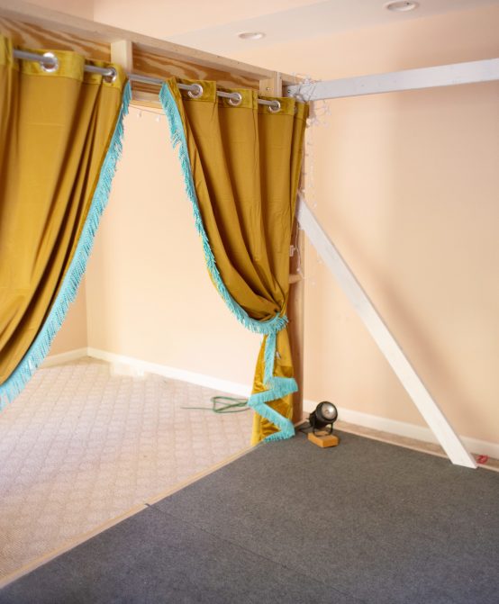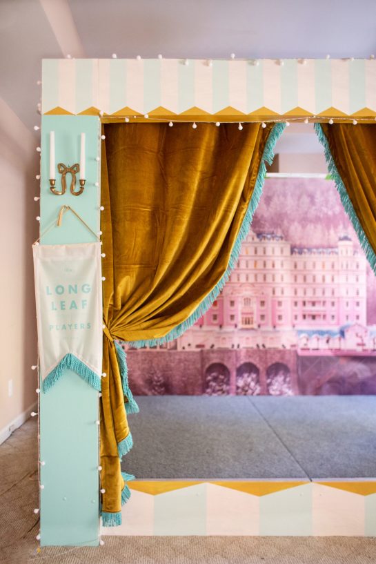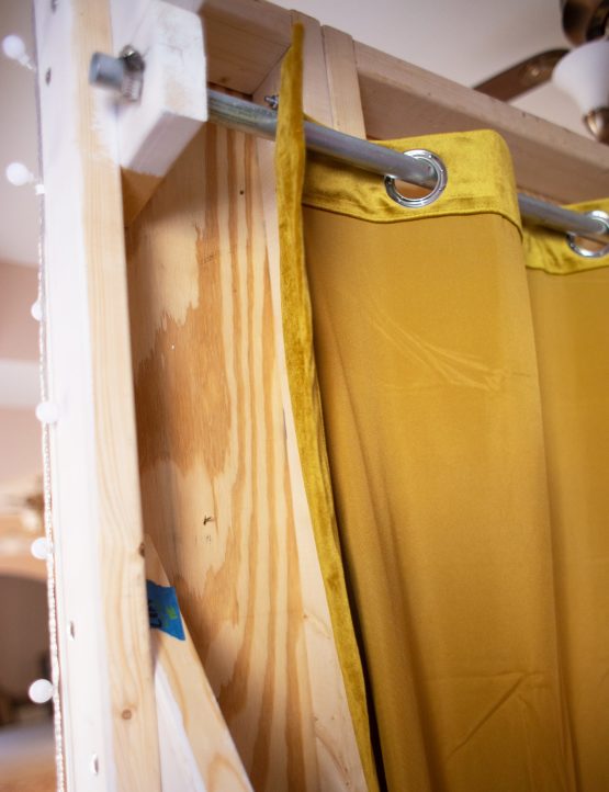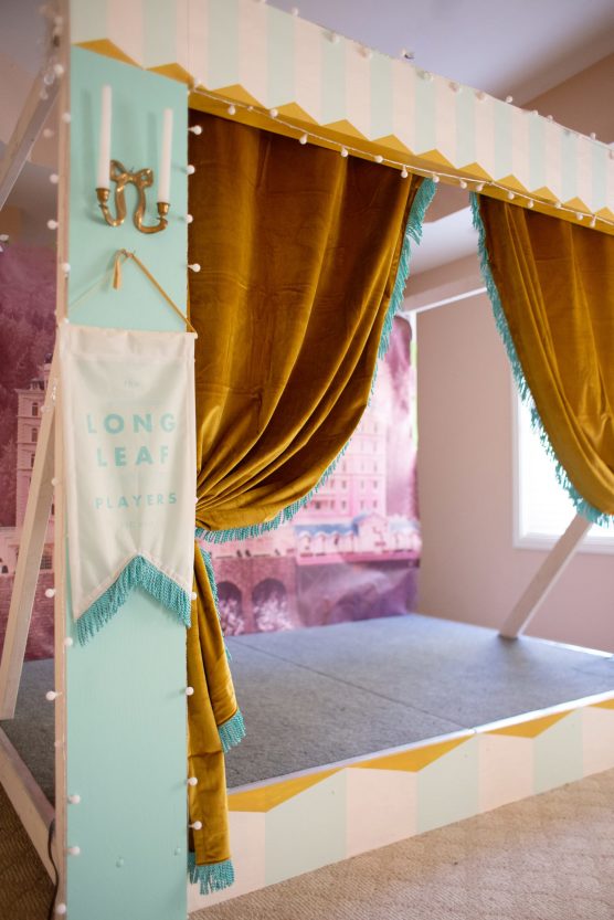I bought these curtains (in the 72" length), and they are so good! They are thick and velvety, and the perfect stage curtains. I added this trim to it to dress them up, and we tacked up these LED lights around the edges of the stage for some extra glow. I found some vintage sconces on etsy and made banners to hang on the vertical panels.