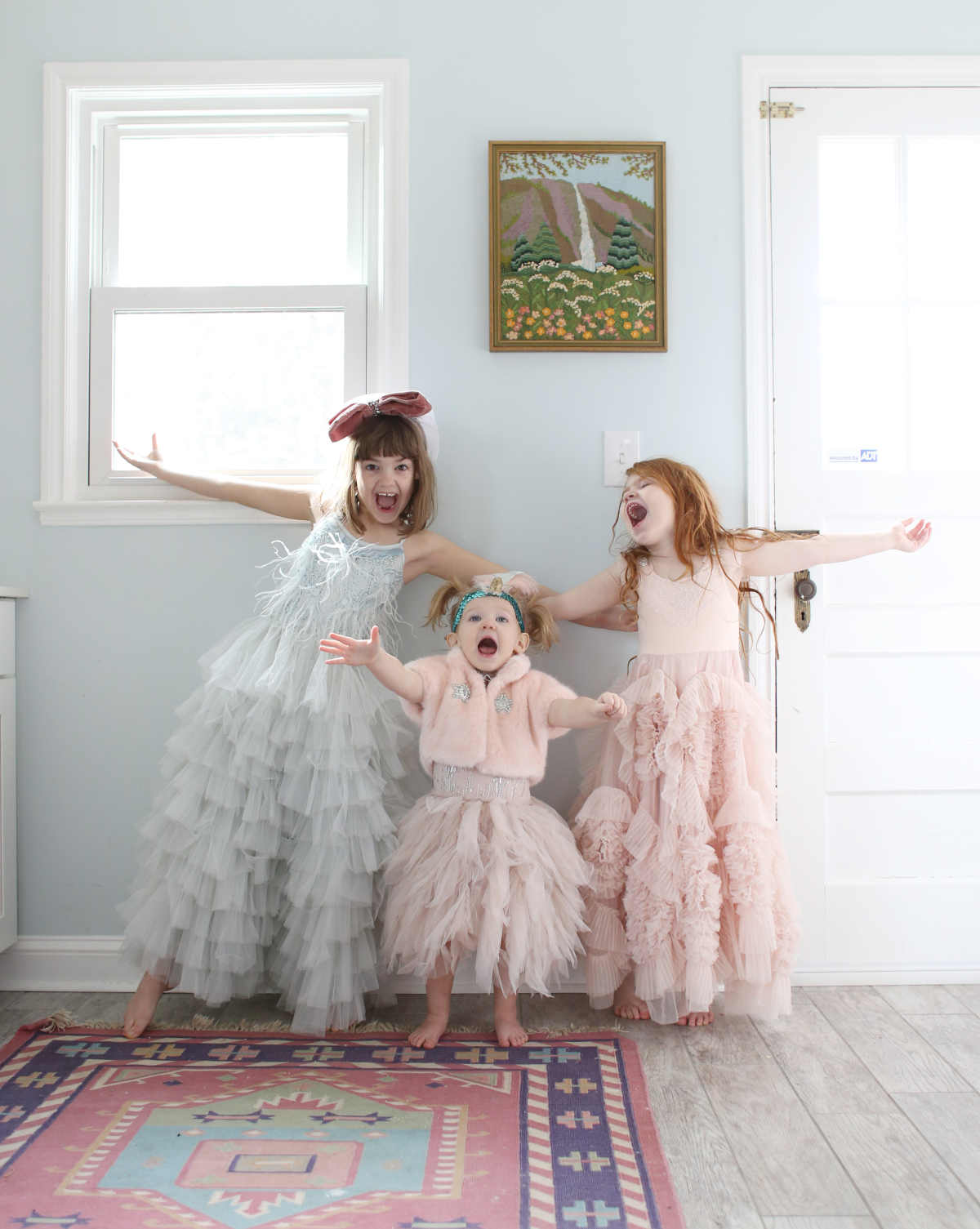 Rainey's Closet is a fashion rental source for kids. So genius, right? (And they have boy outfits, too, you boy mamas out there!) They have everything from accessories to jackets and capelets to dresses. It's also really affordable. Considering how quickly kids grow, it can be quite pricey to buy a whole outfit for an event that they may not even get to wear again. These gorgeous dresses my girls are wearing would be way out of our price range, but you can rent them for four days (or eight, if you choose!) for about $45.