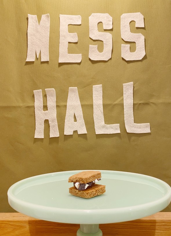 For the backdrop of the food and critter table, I used the green canvas and hot glued cut out felt letters for a vintage camp look.