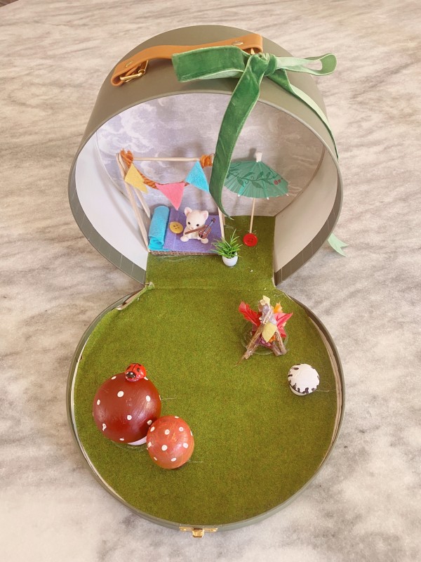 I pre-made little "beds" out of popsicle sticks and cardboard, and had already glued "grass" and a little backdrop I printed out into the suitcases. The girls made little sleeping bags out of felt, and added a little bunting to the top of their beds. We hot glued the mushrooms into their cases so they would stay, but everything else could be moved around!