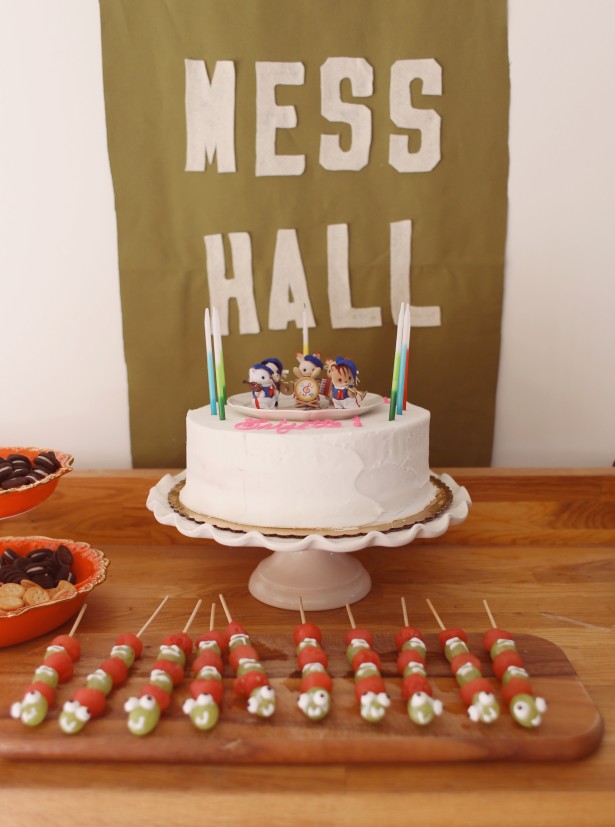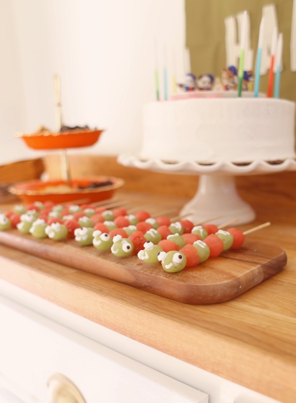 I put some little critters on the cake, and these fruit caterpillars are the cutest! The kids loved them - they are made of grapes and balls of watermelon stuck onto skewers with eyes added on with a little icing. For the food, Brigette really wanted tiny food, so we had baby goldfish, baby ritz crackers, tiny wedges of cheese, and miniature corndogs. The kids ate it all up.