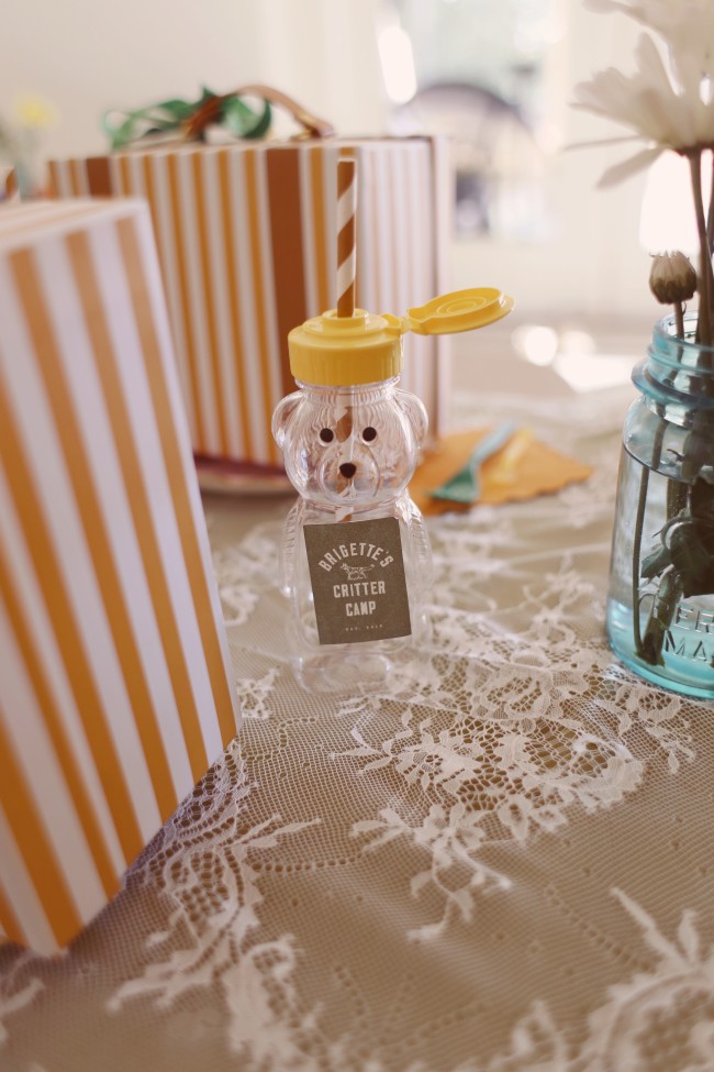 The little "cups" are my favorite! They are little honey jars, and a straw fits perfectly on the top (so no spills, yay!) and I added little labels to the flat part on the front. They were another fun little take home detail!
