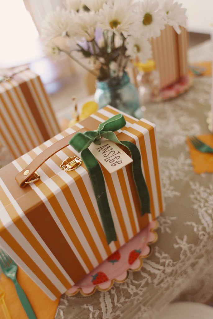 For the table decorations, I used two of these plastic tables (I have them on hand and use them ALL THE TIME - the height is adjustable, so they are great for both kids or adults, and when you throw on a tablecloth, you can't see them at all!) and I added some of this canvas material (I also used it for the banners) layered with a lace tablecloth. We used these cute little strawberry plates, and each place setting had one of these cute little suitcases with a tag on it labeled for each guest.