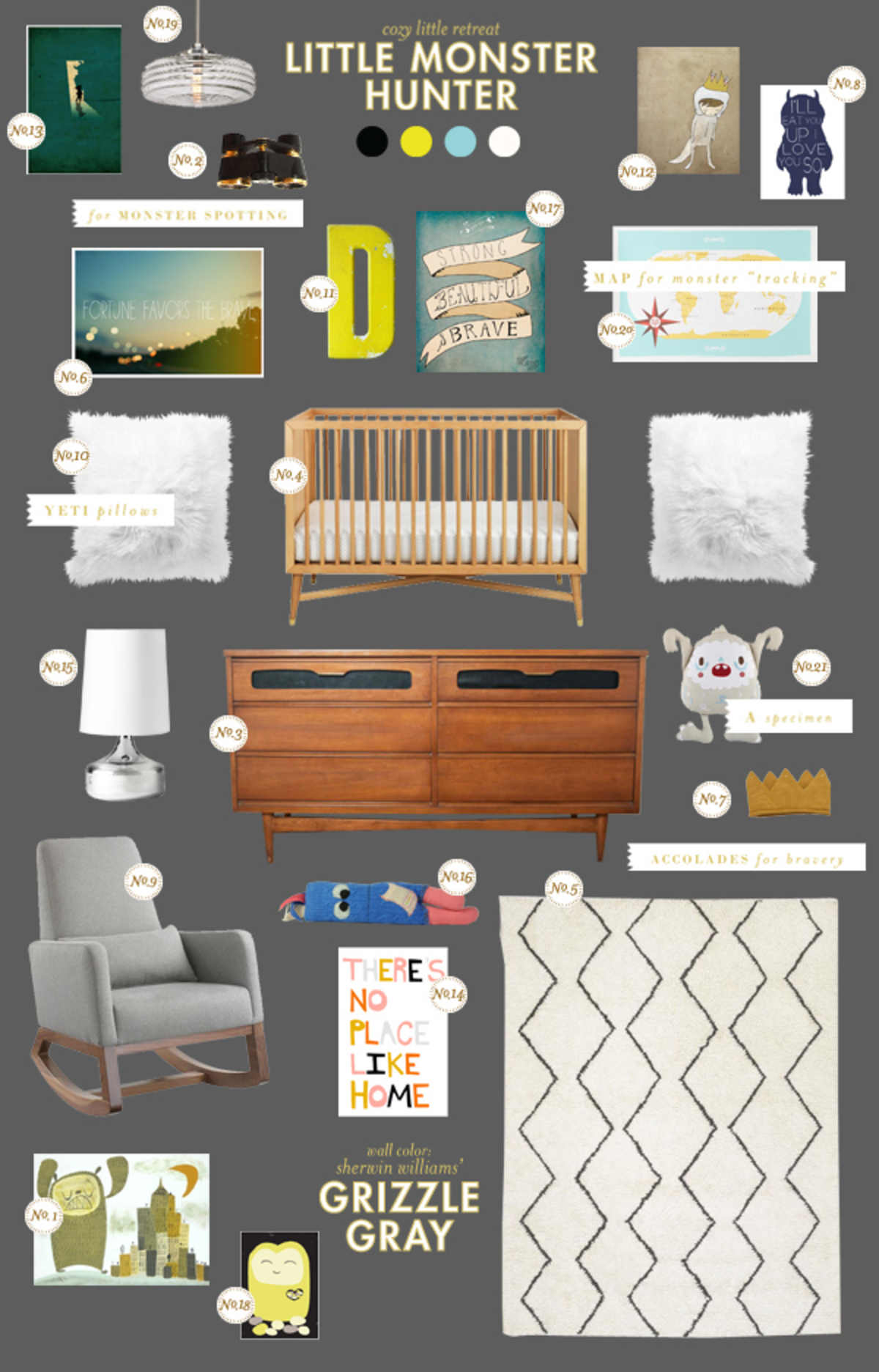 (And the winner of Pippa's quilt giveaway is Bobbie! Congratulations, Bobbie! Thank you to all who entered.)Lately, I have received a few requests for a monster inspiration board, from a vintage Monsters, Inc. look (my favorite Pixar movie) to a Where the Wild Things Are inspired look. Above is sort of a combination of both, and I thought it might be fun to add the twist of "monster hunting" to the board - a particularly appropriate theme with Halloween approaching!