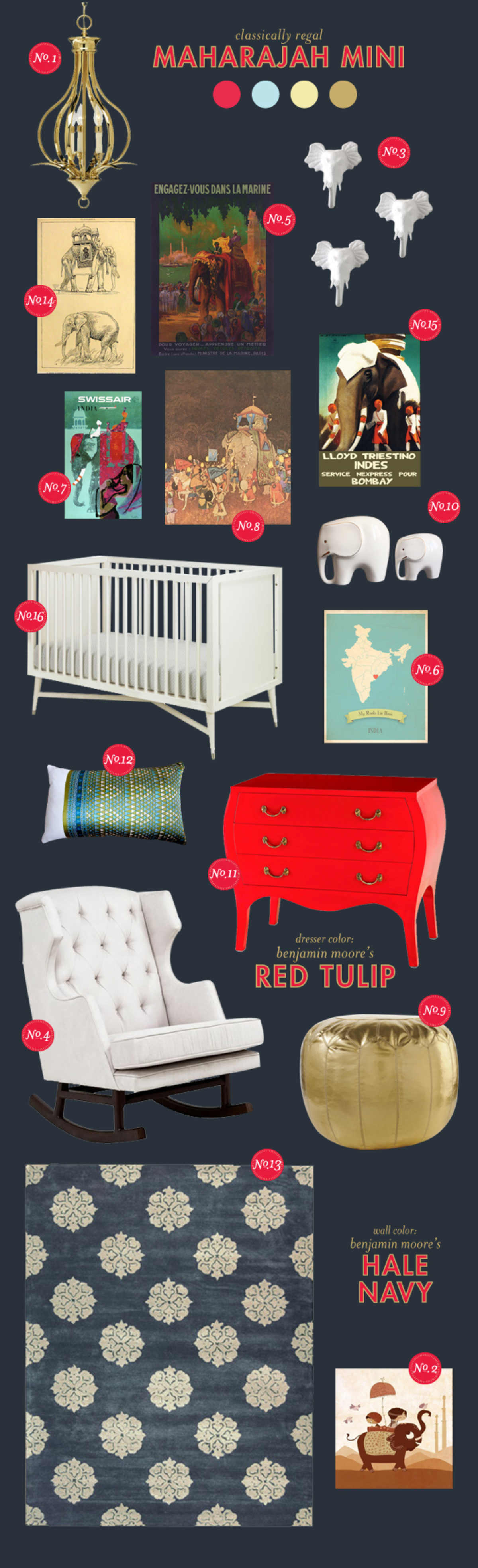 Ankita emailed asking for ideas around a "royal indian" theme focusing on the elephants. I thought that sounded like a lovely idea, and found the above vintage India travel posters to be particularly inspiring. If the dark walls seem too dramatic, a bright aqua or even green would be pretty, and the classic colors keep it neutral, but you could easily tweak the reds to be more pink for a girls' room. That dresser is quite expensive, but I love the heavy glossy finish; Benjamin Moore's red tulip has a touch of pink to it, which would add a lot of punch to the room should you have an old dresser that needs a facelift.
