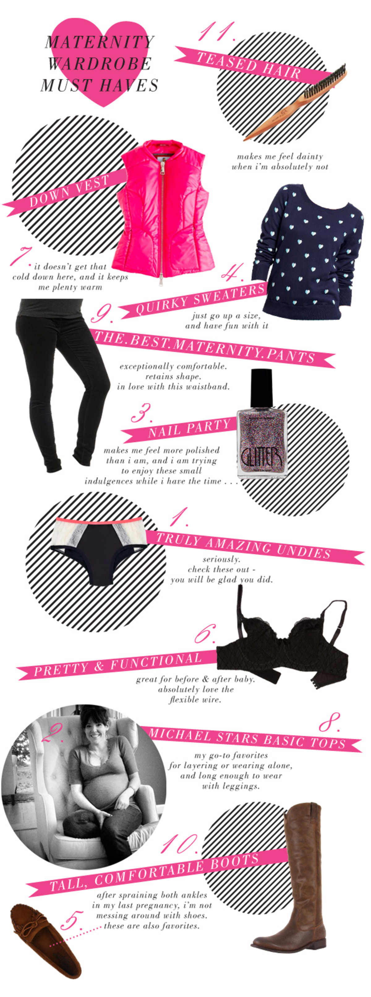 I rarely post about fashion on the blog- I don't pretend to be an expert - but some of you have inquired about my maternity favorites, and it's worth sharing some things I have found that really work well because I know it's not always easy to figure this out, especially the first time around. Above are some of the basics that make my maternity wardrobe work. Keep in mind I live in Georgia, so fall/winter is quite mild and I don't need heavy outerwear, etc. and I also stay home with Vivi, so mostly I need function and comfort that also makes me feel cute and pulled together. I have a down vest that I love for extra warmth (no, not the gorgeous $500 plus version above, but I love it) and the Michael Stars tops are my favorites - specifically the shine tanks (that don't seem to be available anywhere right now) and the henleys. Truly, the pants above are great. I love the low, but not too low, panel, and they are ankle length on me, so they also look great dressed up with heels. I really, really don't like maternity pants (I have tried the belly bands that others rave about, but they just don't work for my pear-shaped self) and the full panel, while comfortable, makes me feel a bit like a stuffed sausage or something. The designer jean options are pretty great, but I'm not willing to spend that much for such a short period of time. I'm 33 weeks now, and these cords are still serving me well. I also go to Old Navy now and then (rarely to never went before toddler world) to get items for Vivi, and I have discovered their bright and happy sweater collection to make great additions to my maternity wardrobe. They are usually on sale, and I get a larger size - try it! And, seriously - those undies - they are great. I'm very picky about that kind of thing . . . and I won't go into all the details, but read about what makes them extra great here. Hope this is helpful to some of you!!
