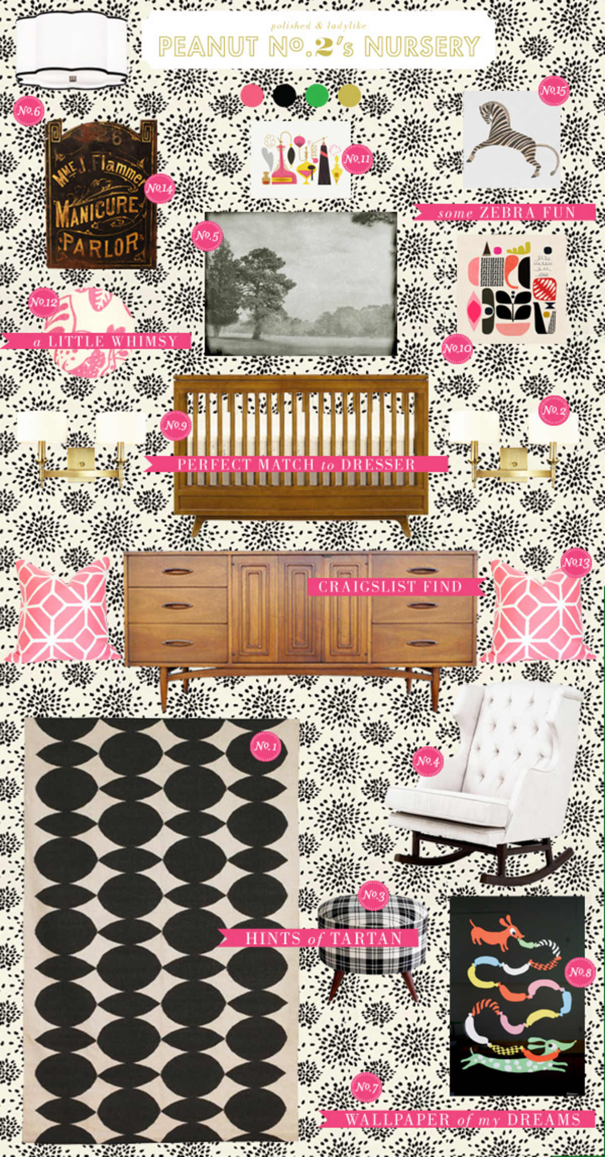I am in the process of wrapping up details on Peanut #2's nursery, so I thought I'd share what I started with for the design of her little room. Some things have changed, but the dresser was the first thing I bought (I was super excited, because it was exactly what I had in my head and I found it on craigslist). An entire room of wallpaper was out of budget, so we settled on one wall with pattern and painted the rest. I'm glad we did, because I think it may have ended up a bit busy, and I'm really crazy over how the color turned out and I can't wait to share! The touches of pink were a later addition because the room was starting to look a little too sophisticated. I'm really happy with that St. Barth's fabric because it has just the right amount of playfulness. Chip says it reminds him of Dr. Seuss. We are getting so close to go time - only four weeks left - and I'm anxious to get all the details ironed out! I sent the artwork to print yesterday, so I just have to paint one piece of furniture, finish up a few pillows, and oh, yeah, tackle that ottoman project.