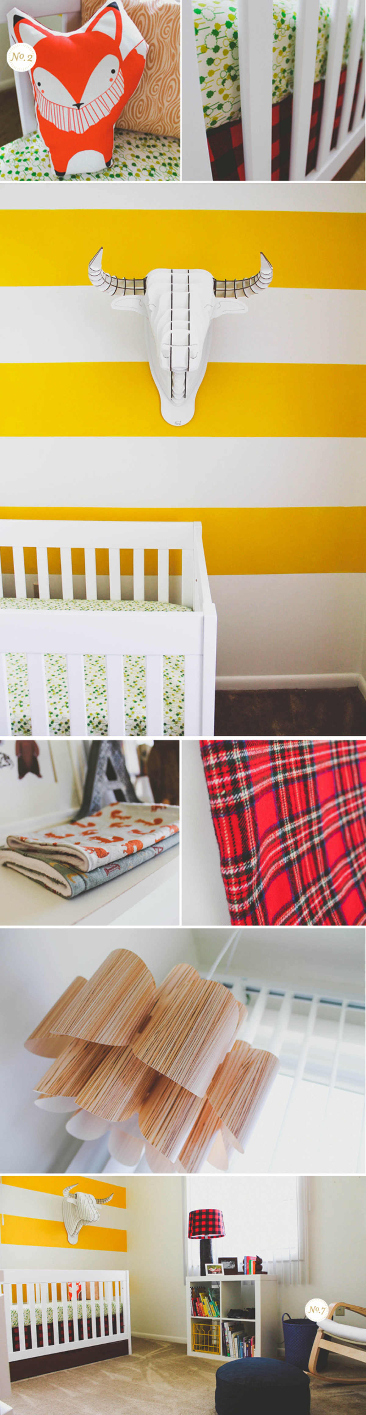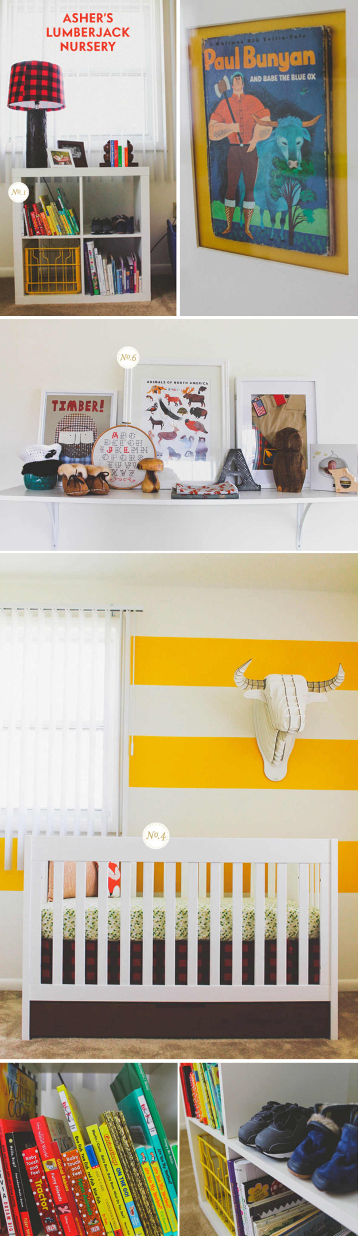I love this lumberjack nursery created by Emily for her son, Asher. She is a military wife and they live in base housing, so she was a bit limited in what she could do to re-invent the space, but I think she did a fantastic job of making the room feel bright and cheery, and I love the clean, modern spin she put on the lumberjack feel. Be sure to check out her blog, with a few more pictures and a list of sources for all the sweetness in the room. If you are loving the lumberjack idea, also check out this Paul Bunyan board and this Lumberjack board for more inspiration.