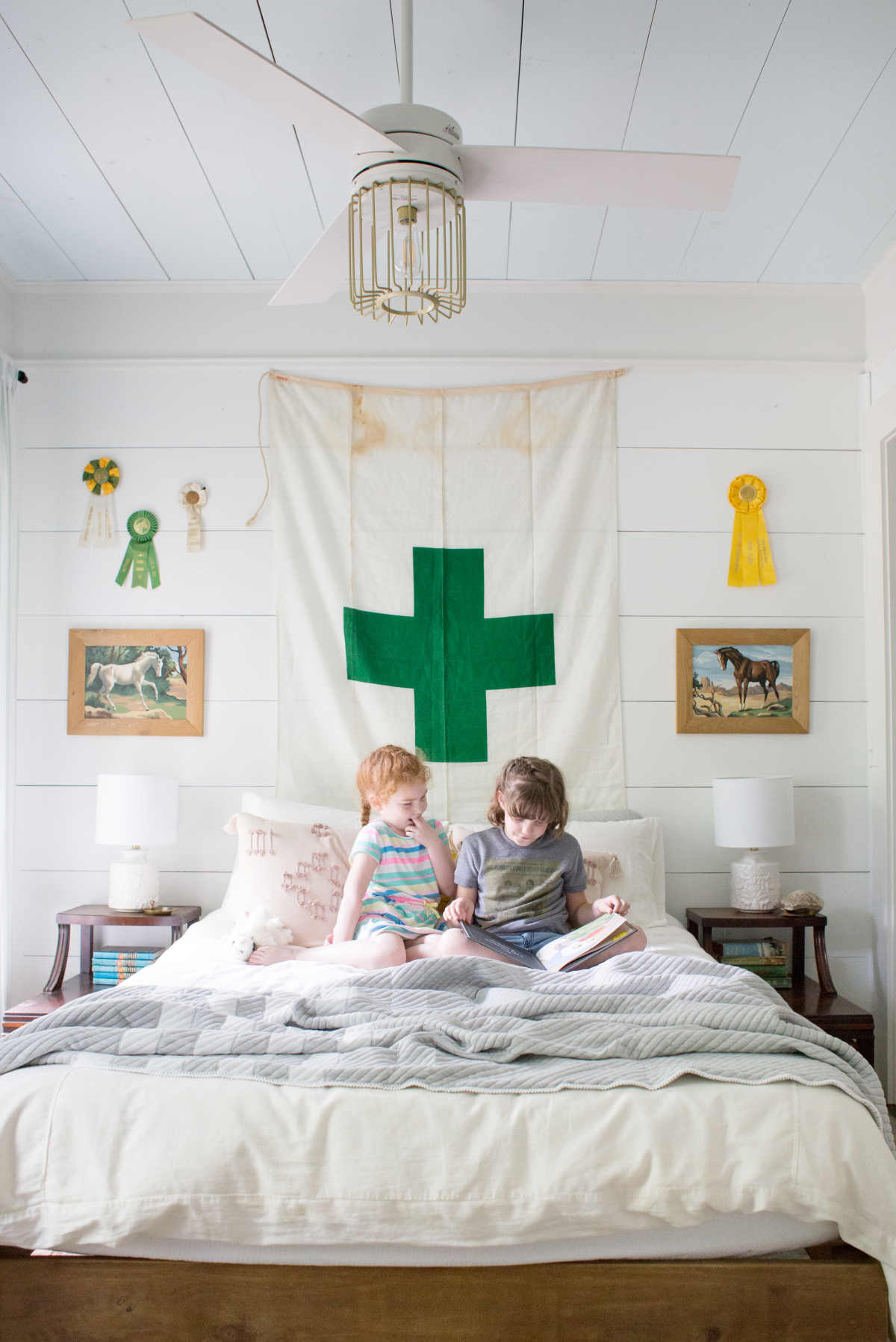 Sources for above: Ronan Fan; Similar paint by number horses; horse ribbons; Ceramic Lamps; Green Stripe Curtains; Peach Pillows; Gold Pillow; Vintage Nautical Flags, Leesa Blanket, Leesa Mattress, Wooden Bed Frame