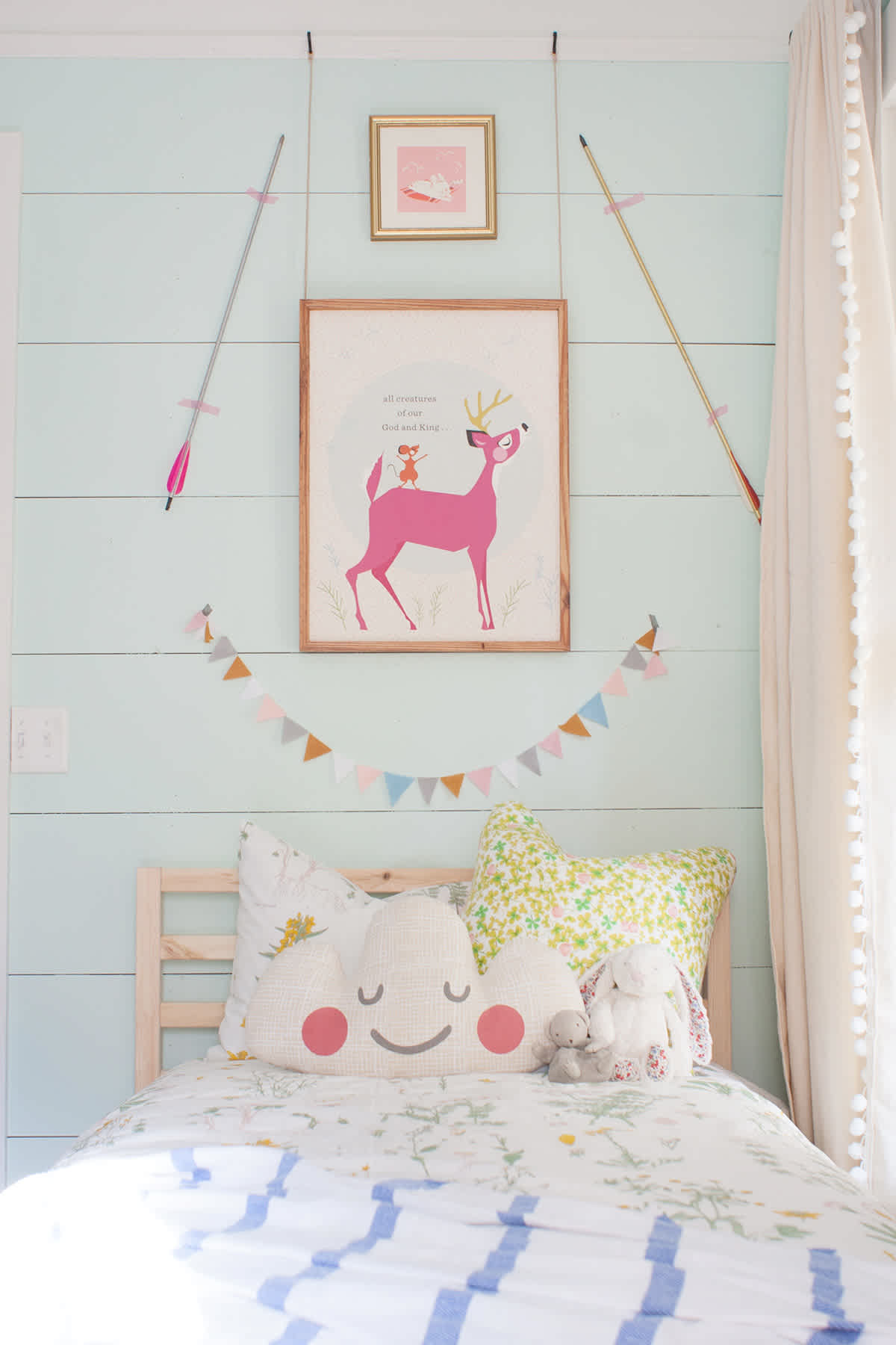 (Walls are Benjamin Moore Lido Green; Curtains are paint drop cloths with pom pom trim; Cloud Pillow; Deer Print)