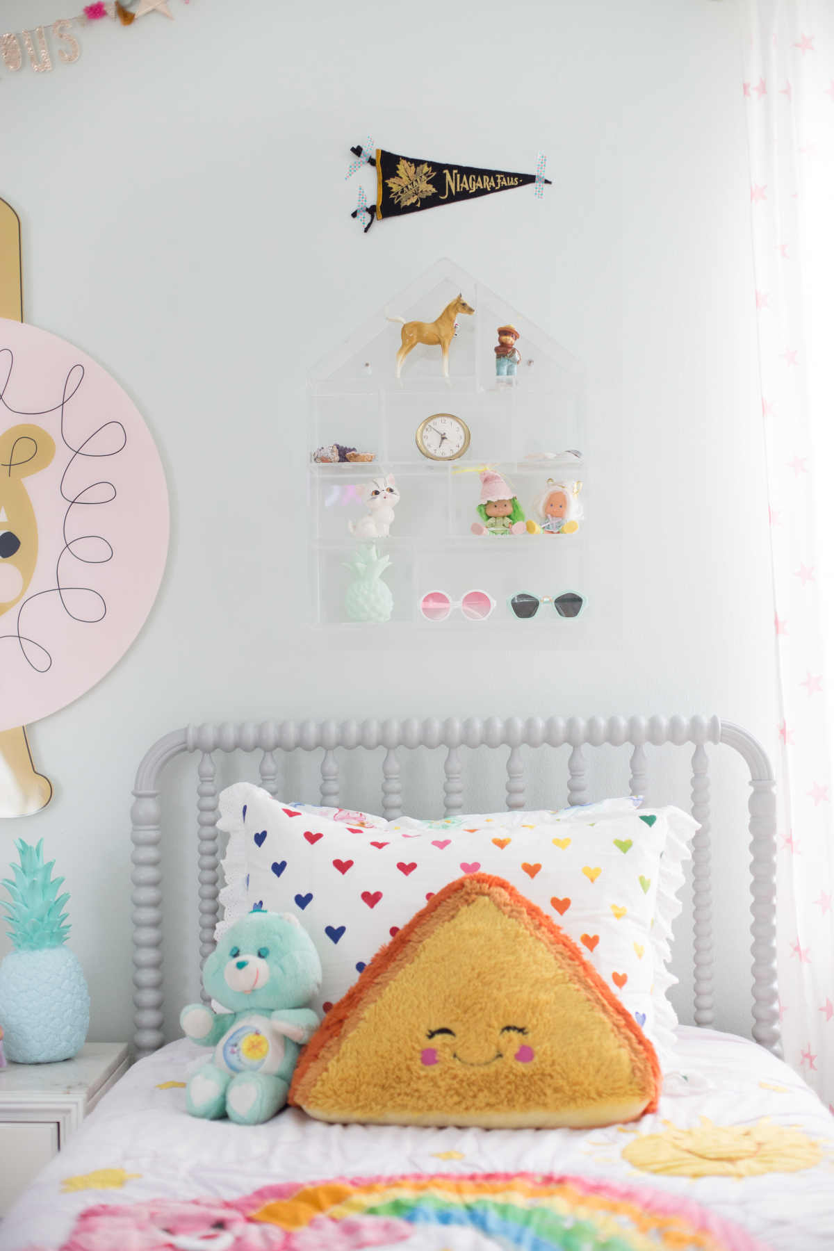 The vintage yellow rotary phone is just a fun play piece.  We don't have it plugged in, but the girls like to play with it, and I love the happy pop of color.  You can find lots on etsy, or when you are out vintage shopping or thrifting!  The BonJour lamp is super sweet, and the girls love their pineapple night light.