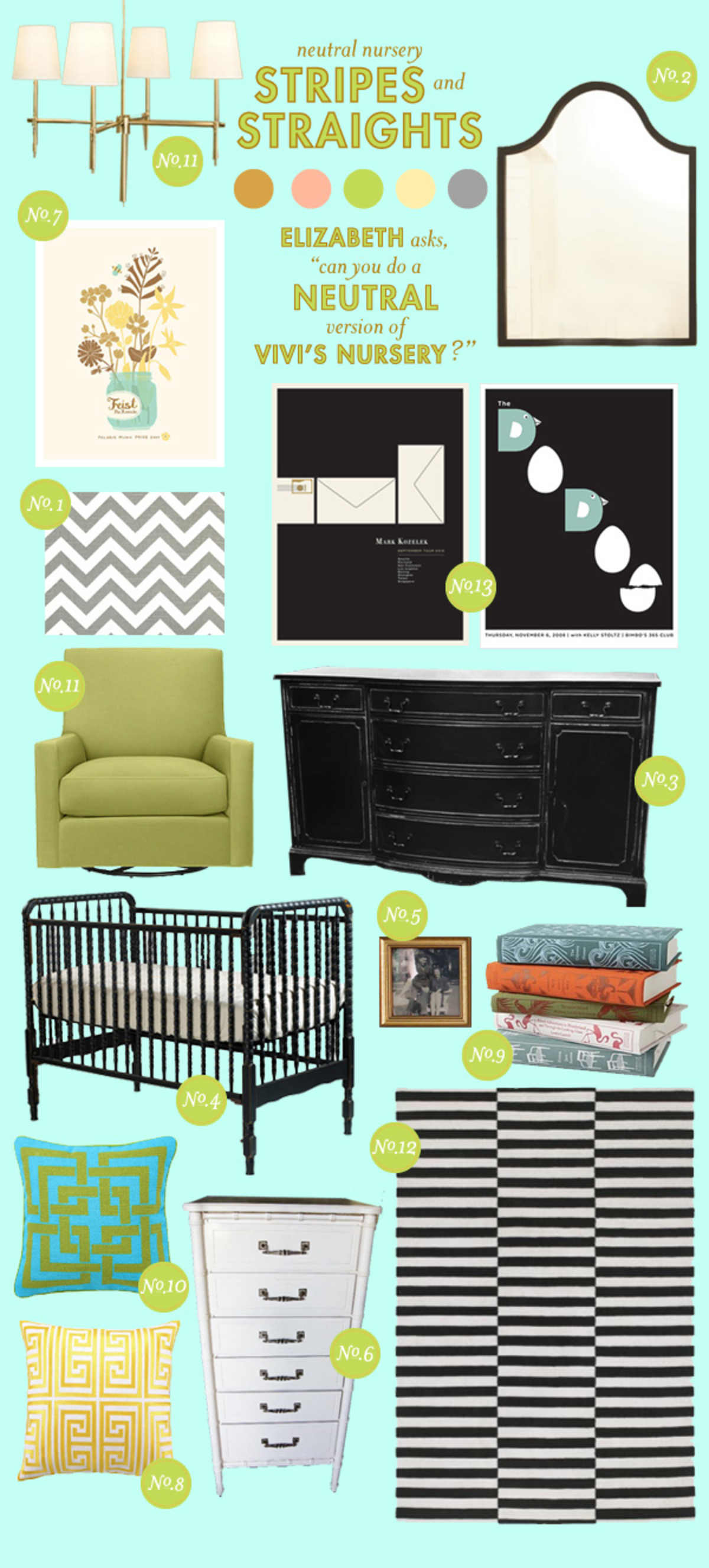 Elizabeth asked for a neutral twist on Vivi's nursery. By sticking to furniture with straighter lines and geometric shapes, and using punches of green and yellow rather than pink, the room takes on a more neutral feel. The Feist poster may be a little more feminine, but I love the colors!