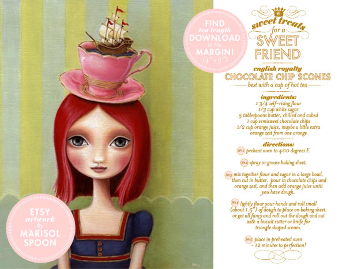 I recently found this fantastic scone recipe while looking for fun items to include in my sister's bachelorette brunch. I thought scones would be difficult to make, but these are surprisingly easy, and extra delicious. I changed the recipe slightly (using self rising flour for simplicity) and I like to use the extra large chocolate chips - and twice as many! You also need to use a good bit more orange juice than the recipe link calls for, so just keep that in mind. I love making them for a friend who has just had a baby - taking over supper, and including a few of these makes the gift last longer, because they can have them for breakfast the next morning - or a middle of the night sweet when up with a baby who has no concept of time. It's like a hug when they need it most. Those long nights can be hard, and who doesn't need to feel like royalty at such a time? Download the 4" x 9" recipe card in the margin to print it out and include with the scones - maybe tuck a few of your favorite hot teas in there, too! These would be a super yummy pairing! (Link to the pretty pretty artwork is in the margin.)