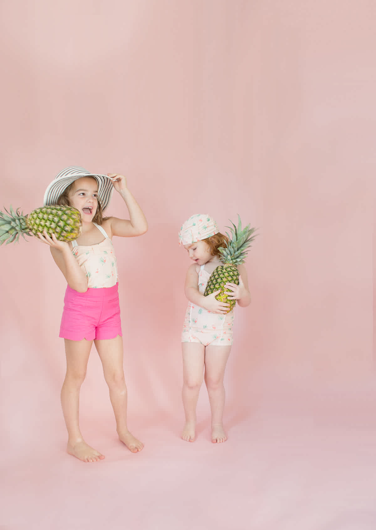 I've been a longtime fan of Janie and Jack's adorable swimwear; I usually include a few pieces on the swimwear roundups I do each spring, so I was really excited to get to try out some ensembles on the girls. They are just as precious in person, and the vintage styles make them perfectly appropriate, which I love. And seriously, I feel like that swimcap was made for Brigette. I know technically all her hair should be in it, but I couldn't resist letting her red curls peek out. She has nicknamed it "cappy" and likes wearing it to her swim lessons, which is just the cutest.