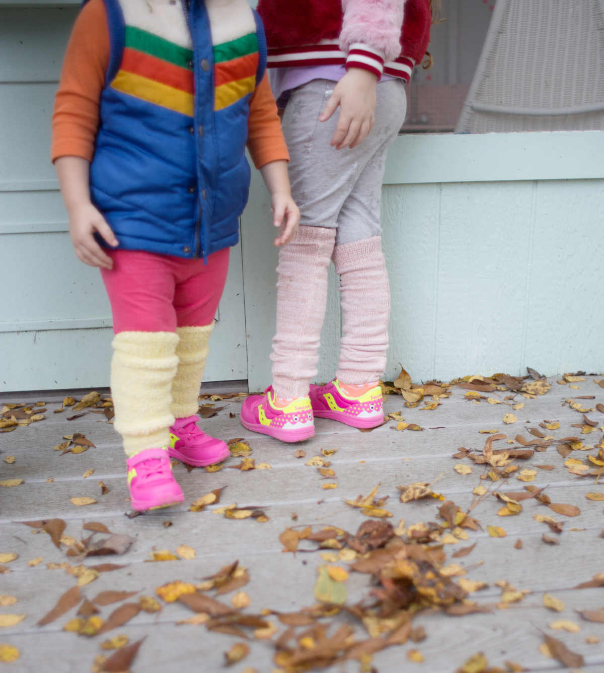 (pictured above: Vivi's Saucony Ideal Sneakers; Brigie and Ellie's Saucony Monsters; Vivi's leg warmers; Brigie's Leg Warmers; Brigie's Jacket; Vivi and Brigie's Vest; t-shirts are vintage)