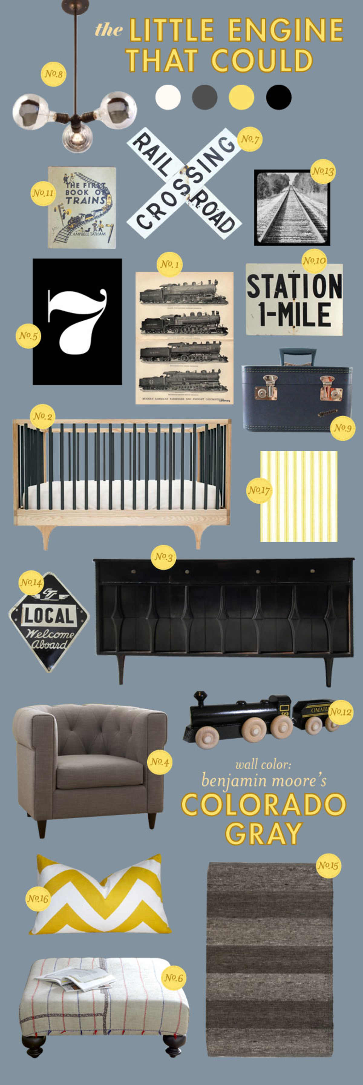 Something about the great rumble of a train passing by with its sharp, loud whistle makes me happy. Maybe because it reminds me of my childhood, or maybe because these remnants of yesterday's great engineering feats have a timeless and consistent quality, but either way I find this a fitting focus for a nursery. And besides, what little boy doesn't like trains?