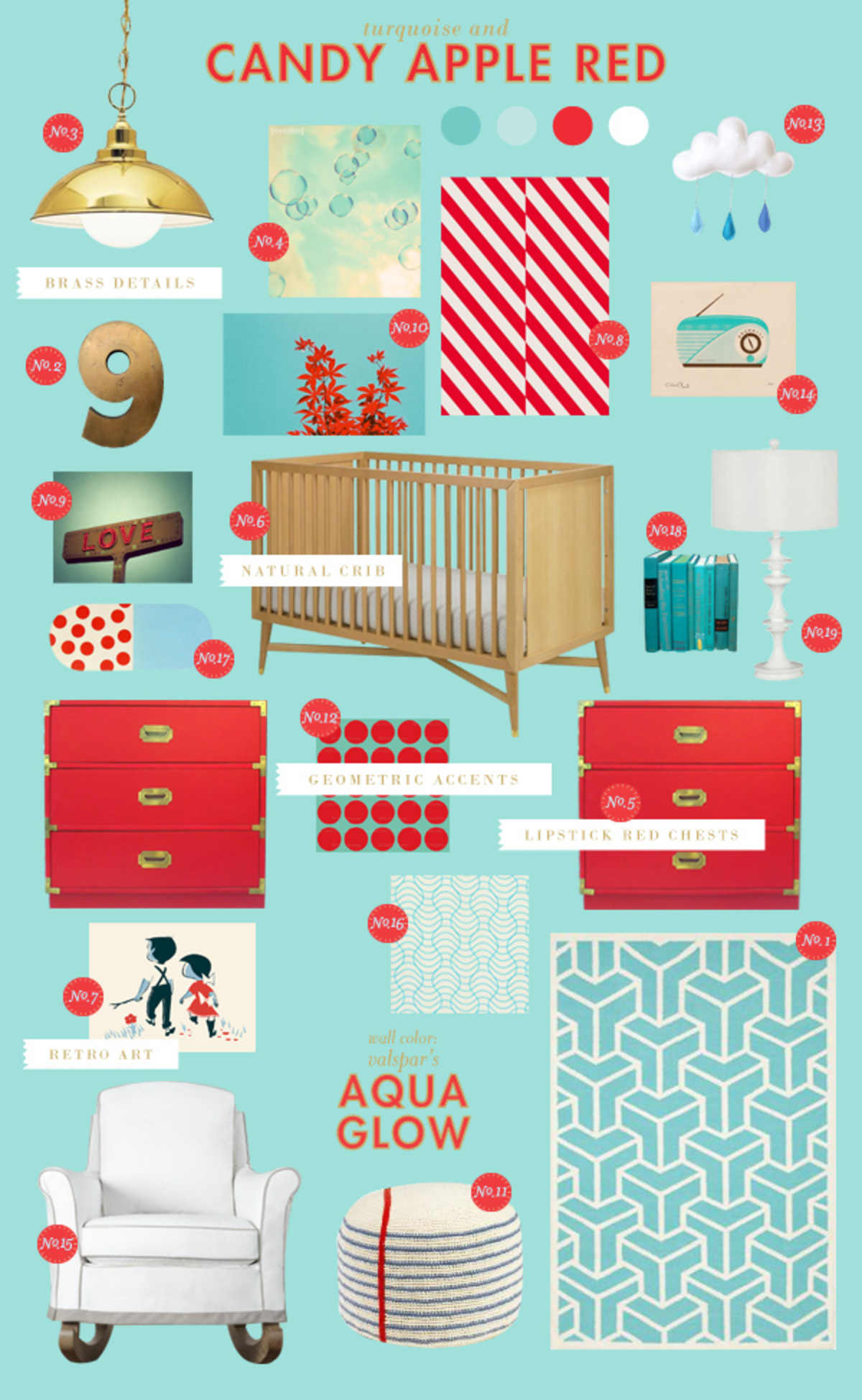 Congrats, Annie, on winning the ship diagram and the photo! It seems a lot of you are looking for aqua and red nurseries, so I thought I'd do an updated version. Those gorgeous dressers are perfect for this room, and if you are feeling ambitious, check out this great little ikea hack to imitate the look.